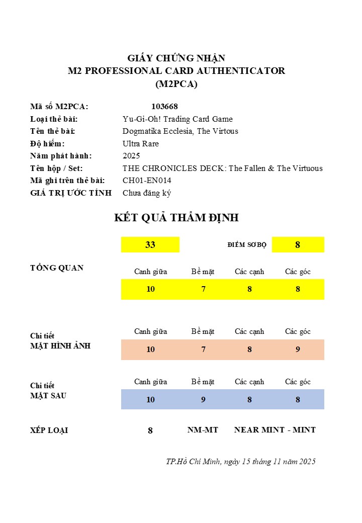 M2PCA - M2 PROFESSIONAL CARD AUTHENTICATOR103668 M2PCA – DOGMATIKA ECCLESIA, THE VIRTUOUS – ULTRA RARE – CH01-EN014 Đăng vào 05/11/2025 bởi system 05 Th11 103668 M2PCA – DOGMATIKA ECCLESIA, THE VIRTUOUS – ULTRA RARE – CH01-EN014