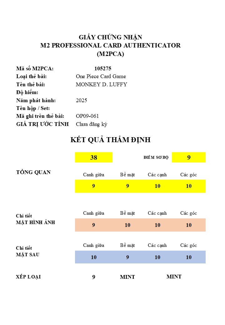 M2PCA - M2 PROFESSIONAL CARD AUTHENTICATOR105275 M2PCA – MONKEY D. LUFFY – OP09-061 Đăng vào 09/01/2026 bởi system 105275 M2PCA – MONKEY D. LUFFY – OP09-061
