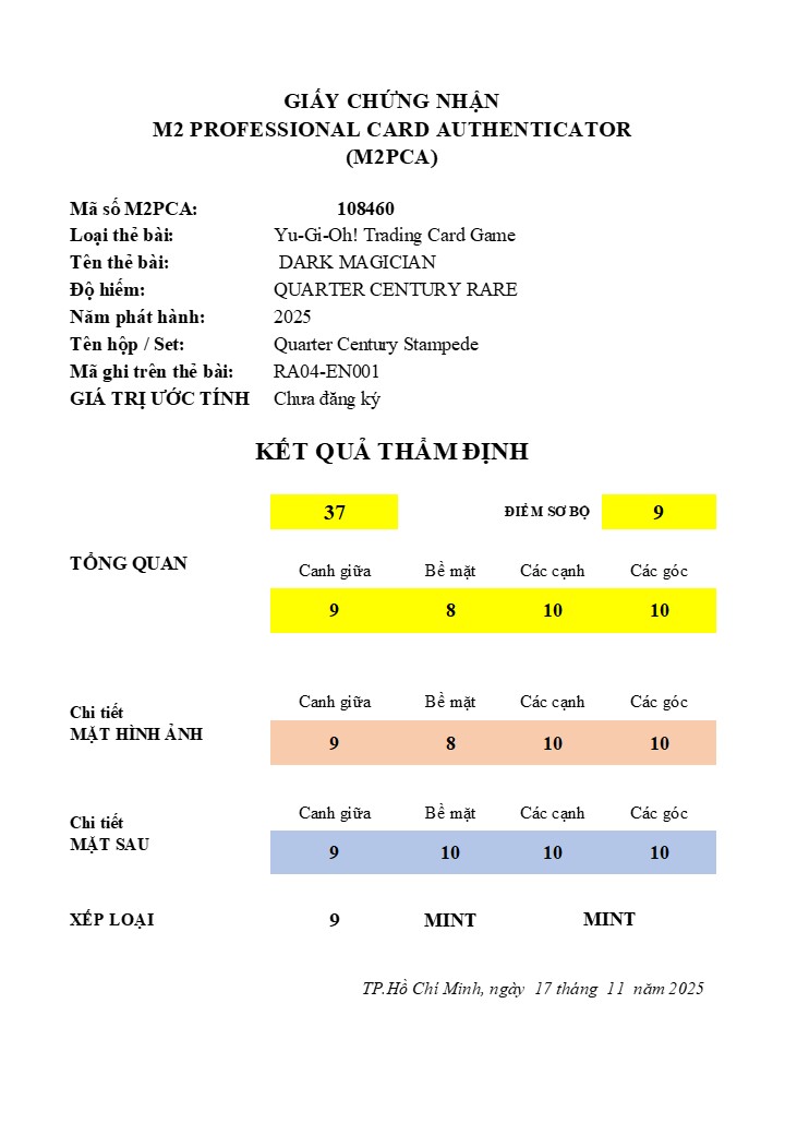 M2PCA - M2 PROFESSIONAL CARD AUTHENTICATOR105798 M2PCA – DARK MAGICIAN – QUARTER CENTURY RARE – RA04-EN001 Đăng vào 10/11/2025 bởi system 10 Th11 105798 M2PCA – DARK MAGICIAN – QUARTER CENTURY RARE – RA04-EN001