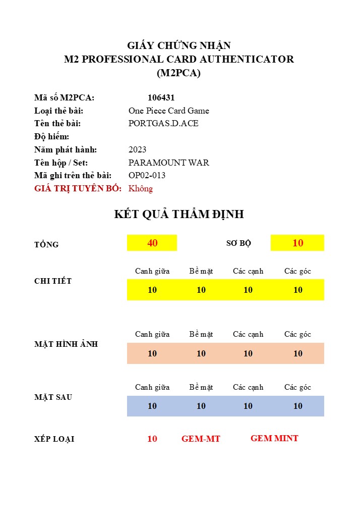 M2PCA - M2 PROFESSIONAL CARD AUTHENTICATOR106431 M2PCA – PORTGAS.D.ACE – OP02-013 Đăng vào 25/11/2024 bởi system 25 Th11 106431 M2PCA – PORTGAS.D.ACE – OP02-013