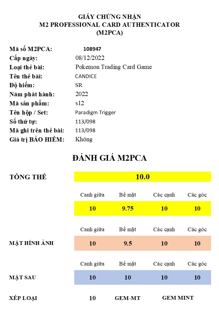 M2PCA - M2 PROFESSIONAL CARD AUTHENTICATOR108947 M2PCA – CANDICE – Super rare – 113/098 Đăng vào 02/12/2022 bởi system 02 Th12 108947 M2PCA – CANDICE – Super rare – 113/098